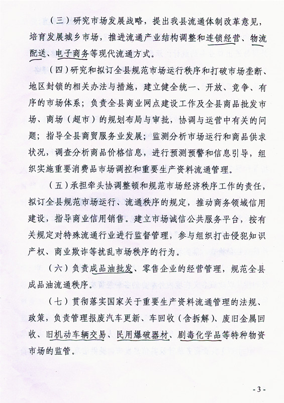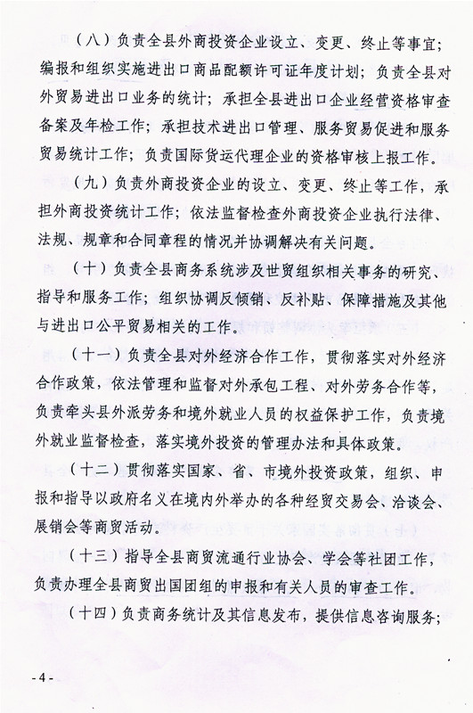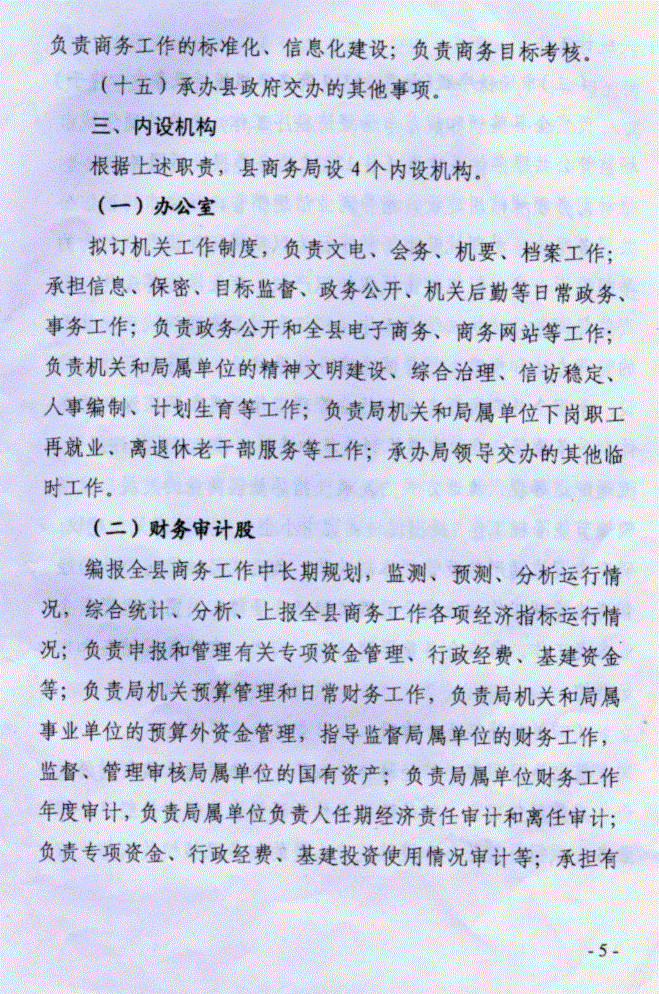 安茜:党委委员,工会主席。分管内贸科、商务稽查大队、12312商务举报投诉中心,负责工会、市场建设、运行监测、市场秩序、行政审批、电子商务、法制建设、商务行政执法、打击侵犯知识产权和销售假冒伪劣商品工作、非法集资、行业协会、向上争取资金工作。
